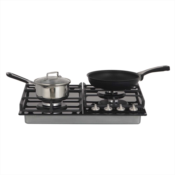 Хорошая газовая панель за приемлемый ценник. Имеет 4 конфорки разного диаметра, самая большая на сковороду в диаметре 28 отлично подойдет, вполне понятный автоматический электроподжиг, срабатывает с первого раза. Решетки очень крепкие, чугунные.
