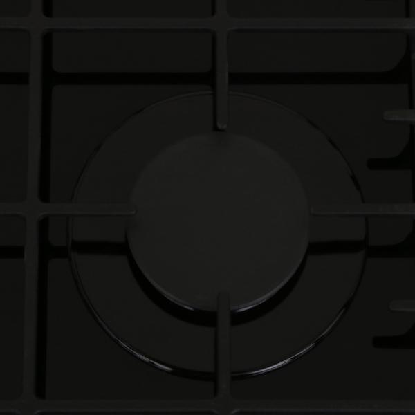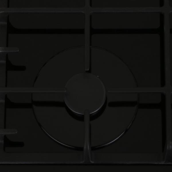 Варочная панель из закаленного стекла. Прочные чугунные решетки. Оснащена электроподжигом, газ-контролем, а так же механическим таймером на отключение большой конфорки.