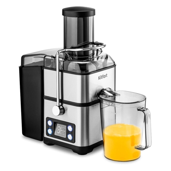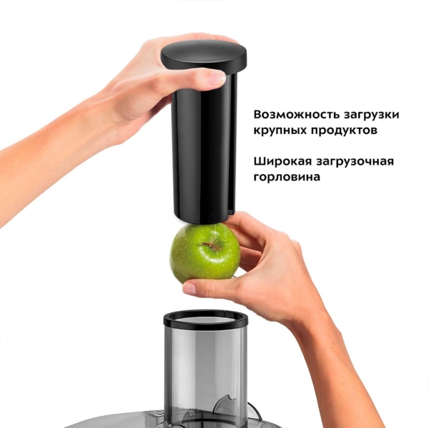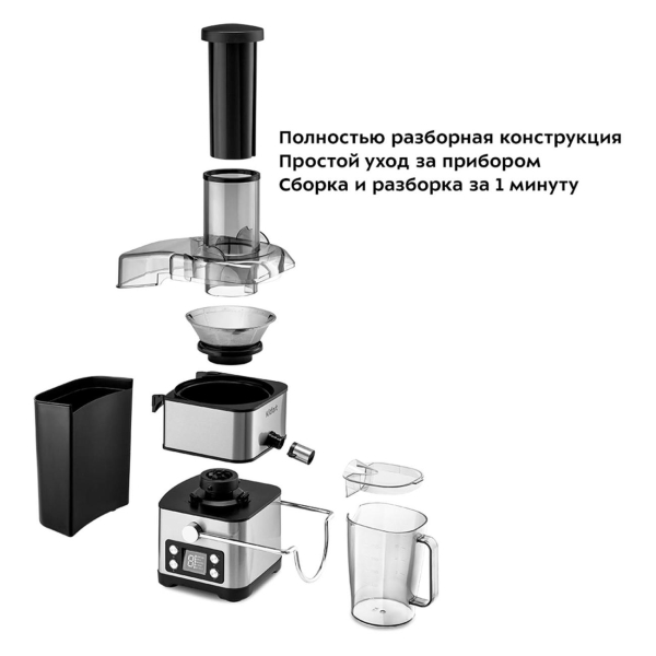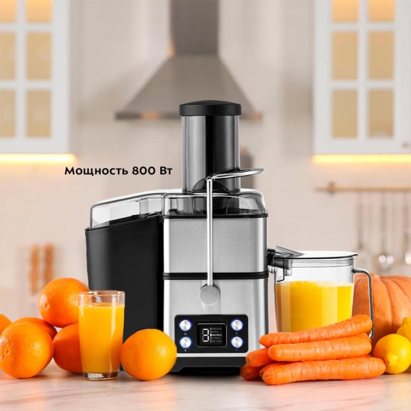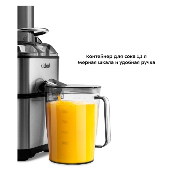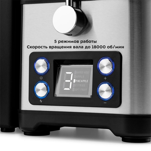 Мощный мотор. Корпус из нержавейки и пластика. Большая емкость для жмыха, 1,1 литровая емкость для сока. 5 режимов для разных фруктов и овощей
