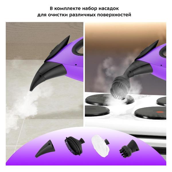 Классный Паровой очиститель!Очень понравился!Теперь всё в доме им намываю.Красивый!Приятно им пользоваться.Удобно,что есть разные насадки.Одна из моих любимых насадка с счёточкой-ей удобно что-нибудь оттирать.И вообще приятно,что сам пар дизонфицирует всё.Шнур хорошей длинны.Цена самого прибора хорошая.Что не мало важно:Очень удобно-постоянно не нужно воду в него набирать.Можно очистить достаточное колличество,вещей,предметов и потом уже доливать воды.Это удобно.И не устаёшь,а с удовольствием ощищаешь,дезонфицируешь,что тебе нужно.Шикарный плюс пароочистителей в целом,что не нужно использовать моющих,химических средств.Благодаря пару всё отмывается,начищается и дезонфицируется.Мне очень понравилось!Шикарная и очень нужная в доме вещь!